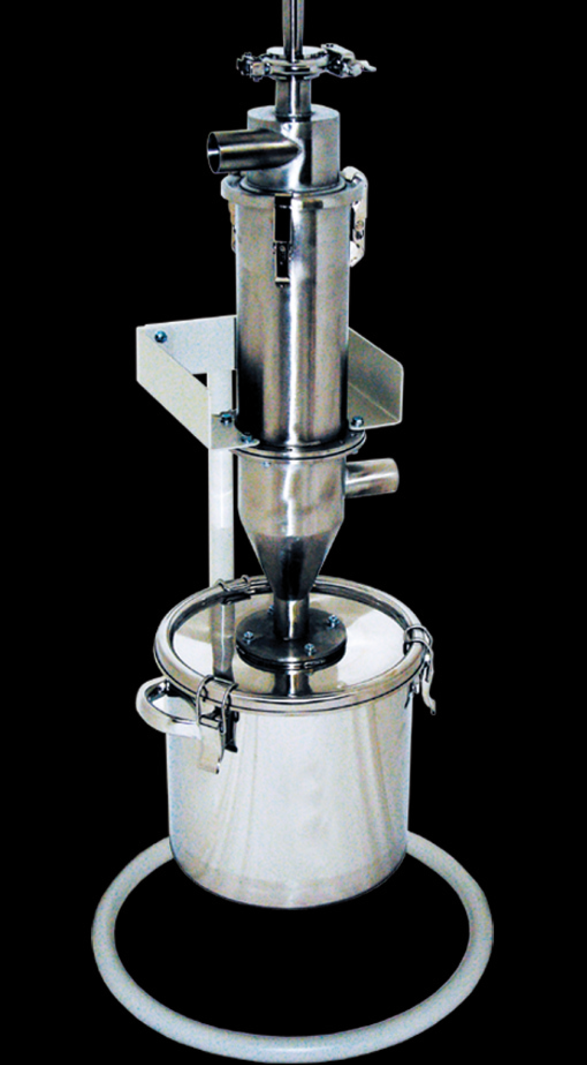 Với tác động của lực xoáy ly tâm được tạo ra bởi lực hút chân không bên trong ống lọc, chỉ có bụi và bột được tách ra từ nguyên liệu qua bộ lọc hình côn có đục lỗ và bị mắc kẹt trong ống thu gom bụi. Tất cả các bề mặt tiếp xúc nguyên liệu đều được làm bằng thép SUS để giữ nguyên liệu không bám bụi và không tạo bột。