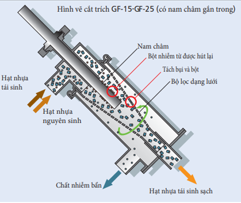 Bên cạnh hiệu quả loại bỏ bụi và bột bằng lực xoáy, nam châm gắn trong cũng có tác dụng hút bột nhiễm từ có trong nguyên liệu. Ống lọc có tích hợp một tấm nam châm mạnh sẽ loại bỏ bụi và bột cũng như hút bột nhiễm từ để tránh các bộ phận đúc không bị tạo cặn lắng hoặc có chất gây ô nhiễm。