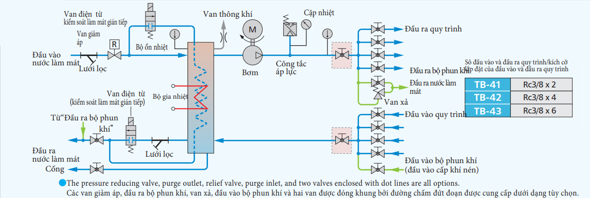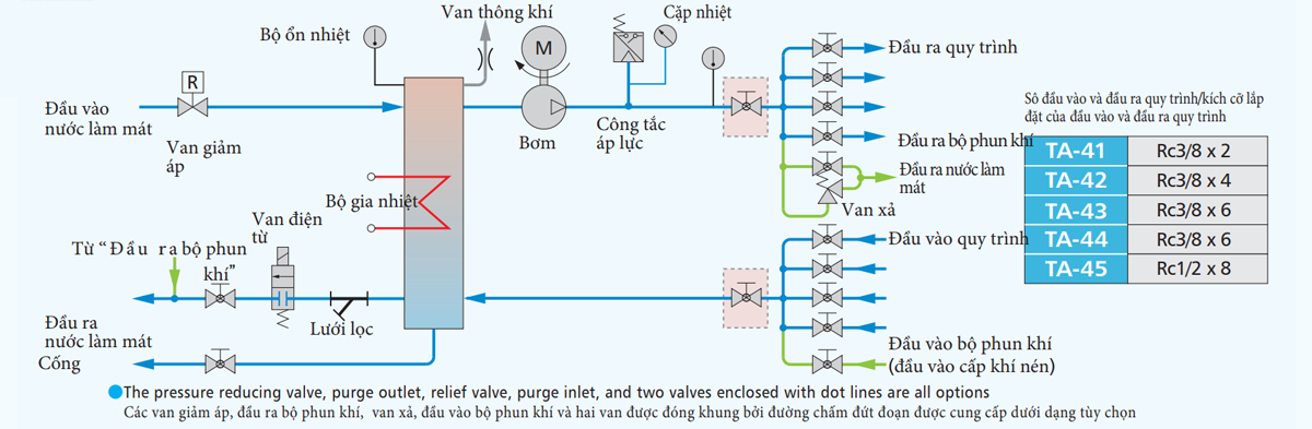 | ●Hãy sử dụng áp suất nước làm mát trong khoảng 0,15 đến 0,2MPa.Trường hợp áp suất của đồng hồ đo vượt quá 0,59MPa, cần phải có van giảm áp ・ van xả。 Không sử dụng nước làm mát với áp suất dưới 0,15Mpa để tránh tạo bọt khí。 ● Lắp đặt một van xả khi chỉ số trên áp kế vượt quá 0,59Mpa trong các trường hợp sau: Chỉ một đường dẫn nước làm mát vào có lắp van giảm áp, hoặc nước làm mát được cấp thông qua lưu lượng kế của máy ép phun nhựa。 ●Khi sử dụng van giảm áp, nếu áp suất nước sau khi qua van giảm áp thấp hơn áp suất thoát nước hồi về tháp giải nhiệt,… thì nước giải nhiệt của bộ điều khiển nhiệt độ sẽ không được xả ra ngoài。 Trong trường hợp này, thoát nước làm mát trực tiếp xuống hố。 ● Van giảm áp và van xả là được cung cấp dưới dạng tùy chọn。 ● Không bao gồm bộ phun khí. Trong sơ đồ này, hai van được đóng khung trong các nét đứt đoạn sẽ tự động được bổ sung khi bạn đặt hàng bộ phun khí。 |